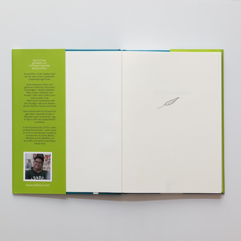Richard Pilor ist der kreative Kopf, der auf dem Cover zu sehenden QuantenspringerInnen. Seine Inspiration holt er sich gerne aus Videoclips, denn seine bevorzugten Motive  – Elefanten, Affen, Löwen, Nilpferde oder Kamele – sieht man in Wien sonst nicht an jeder Ecke. Wenn seine romantische Ader durchschlägt, malt er am liebsten Herzen, Blumen, Sonne und Strand. Seine Familie steht für Richard Pilor ganz oben. Ansonsten findet er Ballspiele super. Schwimmen mag er fast so sehr, wie soziale Medien und Musik. In der Künstlerei des ÖHTB (Österreichisches Hilfswerk für Taubblinde und hochgradig Hör- und Sehbehinderte) in Wien arbeitet Richard Pilor – wann immer er nicht in eine Plauderei vertieft ist – konzentriert an seinen Bildern. Meistens sind es Bleistifte und Buntstifte, mit denen er auf Papier kreativ wird.